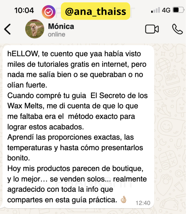 “Tenía miedo de no entender nada porque soy cero tecnológica, pero el paso a paso fue tan claro que logré mis primeros Wax Melts en 2 días. Ahora los vendo en Instagram y mis clientas me piden más cada semana. 🕯️”