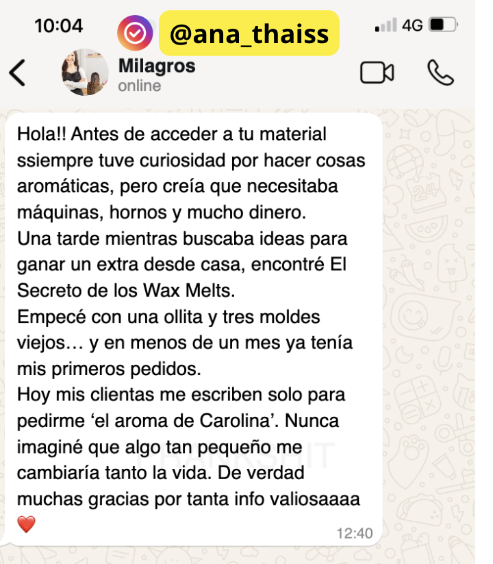 “Siempre tuve miedo de emprender porque pensaba que necesitaba mucho dinero. Con *El Secreto de los Wax Melts* empecé en mi cocina con pocos materiales, y en menos de un mes ya estaba vendiendo mis primeros pedidos. Hoy mis aromas son mi fuente principal de ingresos. 💕”