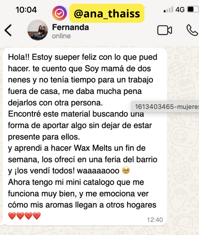 “Nunca imaginé que algo tan simple pudiera cambiar mi rutina. Ahora hago mis Wax Melts los fines de semana, los vendo en ferias y gano un extra que me permite ayudar con los gastos de casa. ¡Y lo mejor es ver cómo todos se enamoran del aroma! ✨”